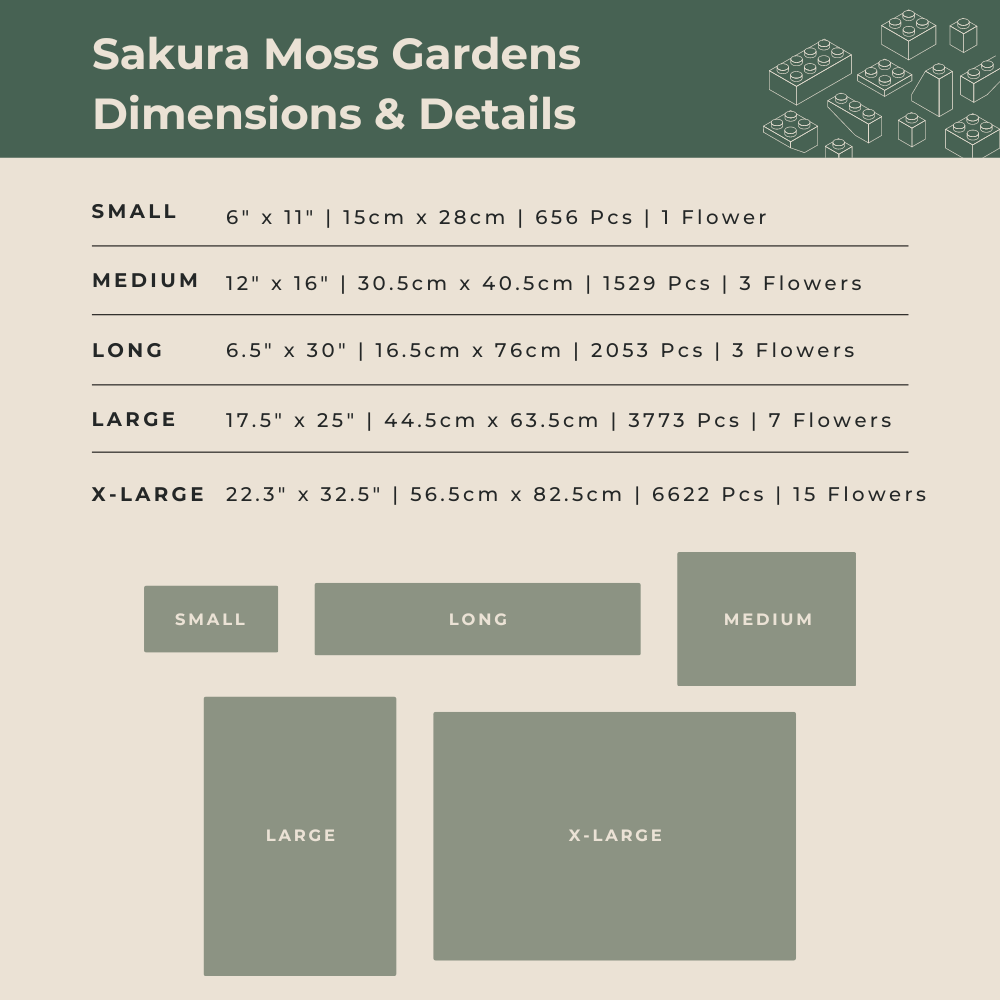 Includes carefully curated high quality bricks with custom colors to bring your moss garden to life