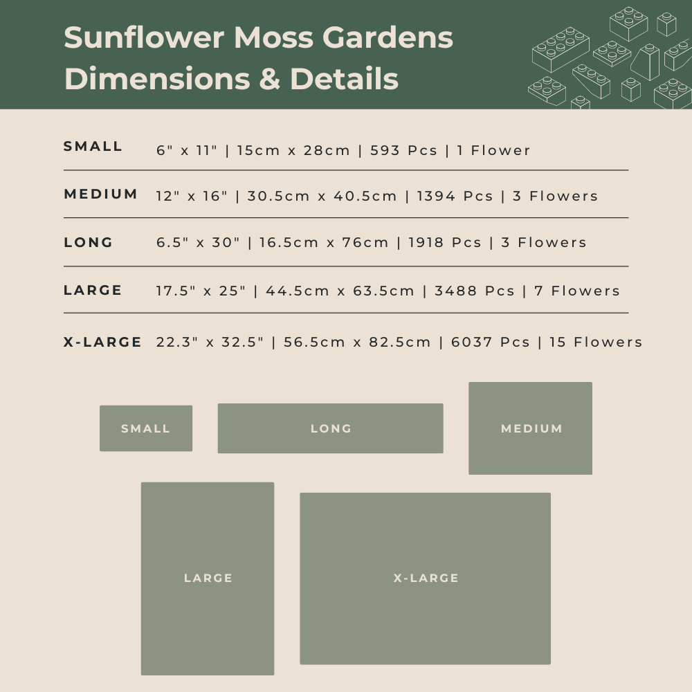 Includes carefully curated high quality bricks with custom colors to bring your moss garden to life