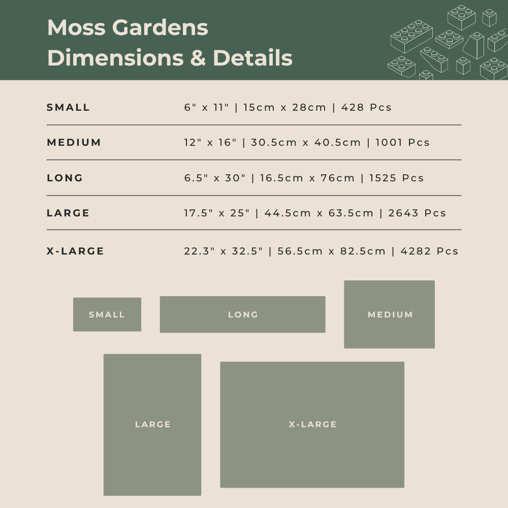 Includes carefully curated high quality bricks with custom colors to bring your moss garden to life